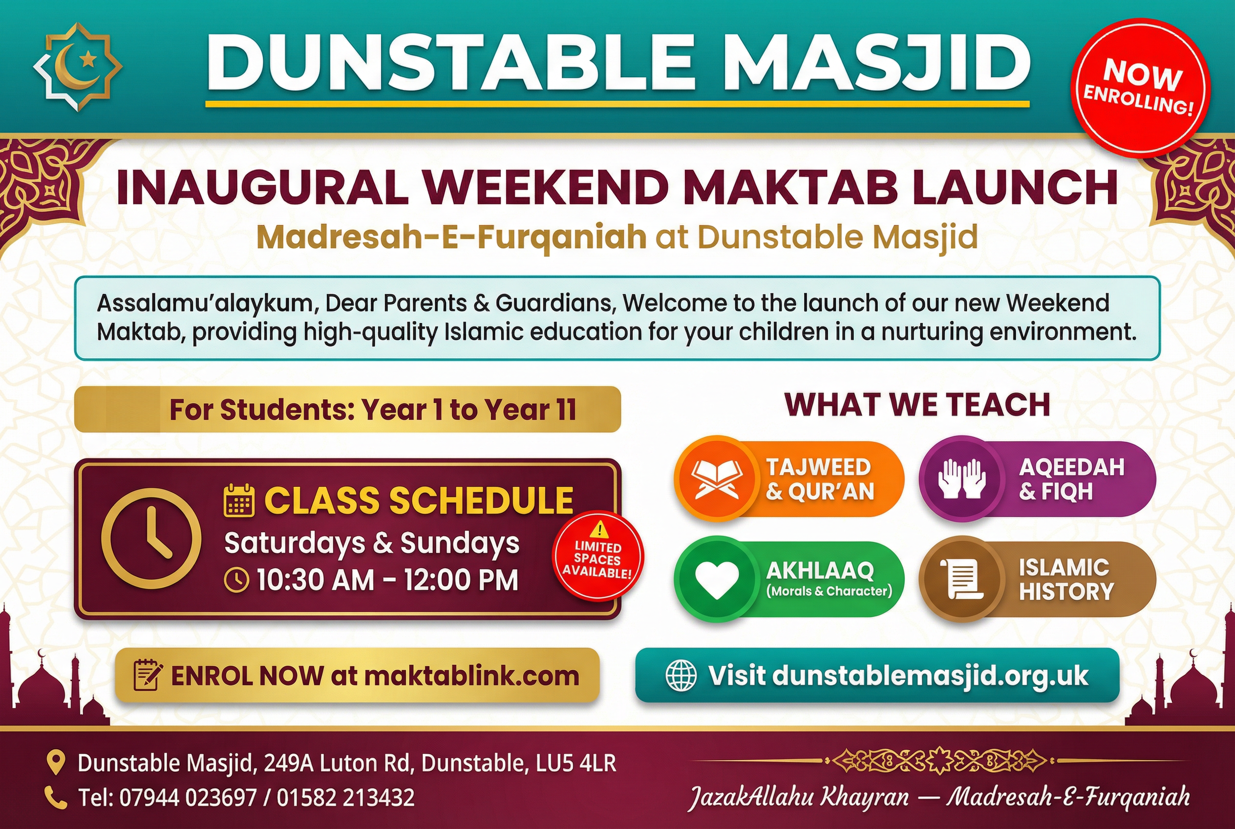 Alhamdulillah, we are pleased to announce that the Madrasah will be starting the Weekend Maktab classes at Dunstable Masjid from 18th April 2026 insha-Allah.*